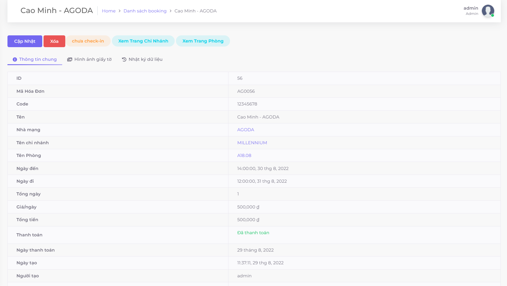 Sau khi tạo thông tin booking của khách hàng. Bạn có thể click vào icon "" để xem thông tin chi tiết của booking đó ở tab "Thông tin chung"
