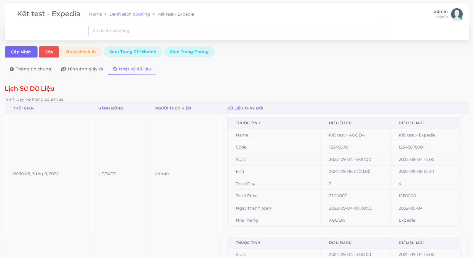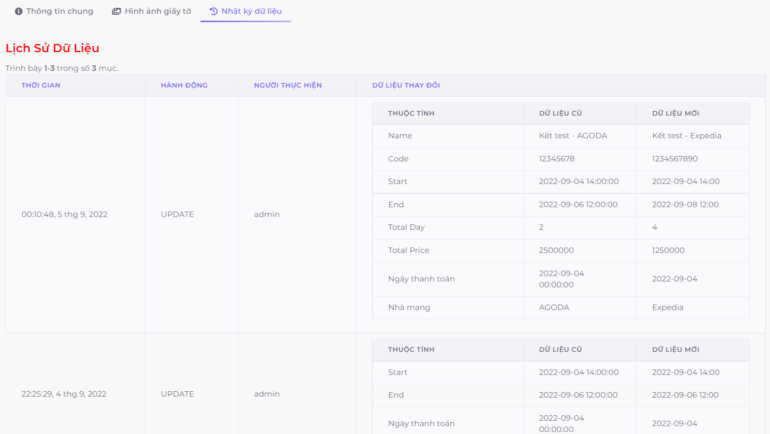 Ở đây khi nhân viên của bạn có chỉnh sửa/cập nhật thông tin nào đó, thì hệ thống sẽ ghị nhận lại các thay đổi và bạn sẽ có thể xem ở tab "Nhật ký dữ liệu" với các thông tin: