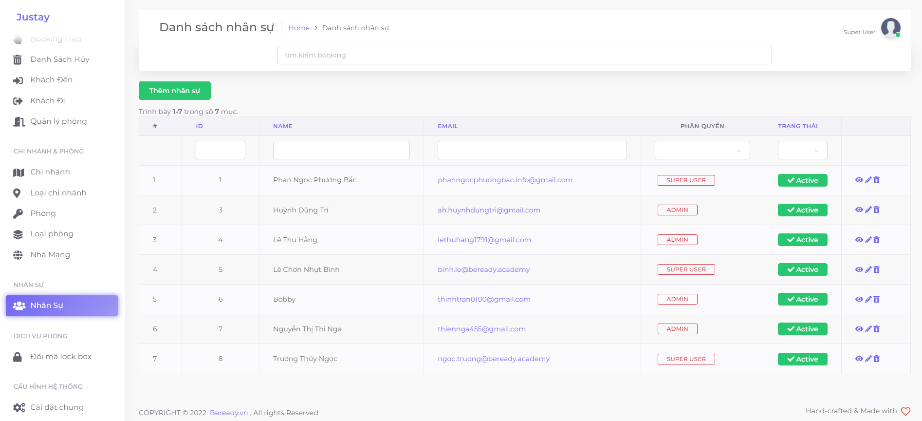 Khi đã thêm tài khoản thành công, thông tin của nhân viên sẽ được hệ thống ghi nhận và hiển thị ở trang "Danh sách nhân sự" -> Ở đây bạn có thể thấy được tổng số tài khoản đang hoạt động và các thông tin của tài khoản đã tạo: